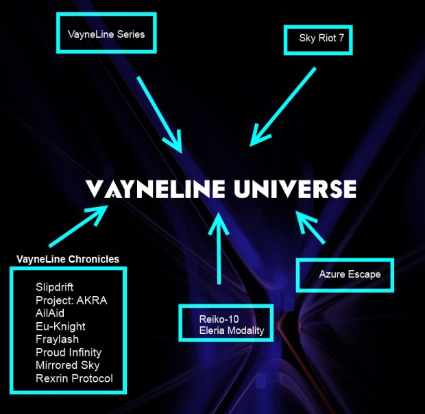Every story is part of the ‘VayneLine Universe’ in that all the stories occur concurrently and are in the same universe literally. There are eight VayneLine Chronicle stories which are longer novellas that tell of side aspects to the longer epic of ‘VayneLine’ itself. There are other books such as Reiko-10 (and its side story Eleria Modality) which again also occur in the same universe and explain various concepts in the series. The free story Azure Escape (which can be picked up on the sidebar free) tells a short prequel to the VayneLine Series