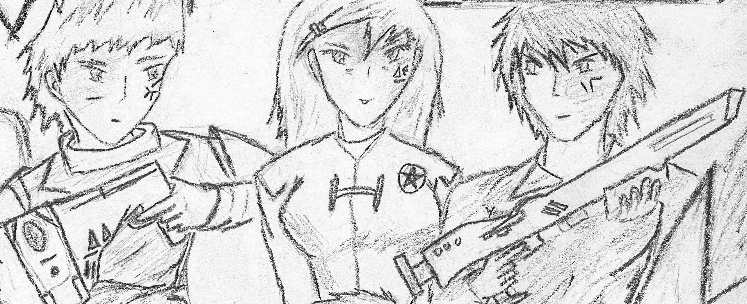 Click for larger image. A sketch of VayneLine characters showing a variation of Strives. Felix on the left has a scar on his right cheek, which is NOT part of the Strive system. Roza in the middle, and Reno on the right show that the ‘path’or ‘way’ particle of the straight line is often ubiquitous in Strives, though it can mean widely different things.